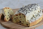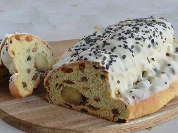 Unieke paasstol met rozijnen, krenten, noten, vruchten, amandelspijs en amarenenkersen, overgoten met witte chocolade.